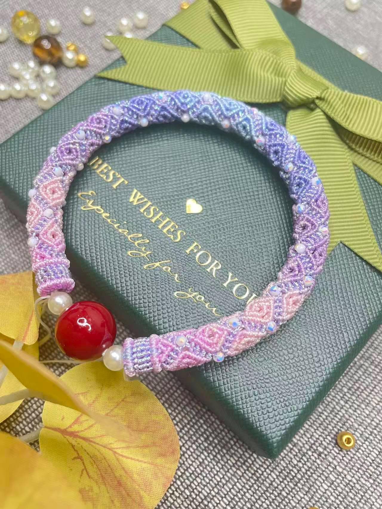 Soft, dreamy, and full of gentle magic — this pastel macrame bracelet is handwoven in a purple-to-pink ombré gradient, decorated with tiny iridescent beads that shimmer in the light. A bold red agate bead at the center adds grounding energy and a touch of contrast, balancing sweetness with strength.