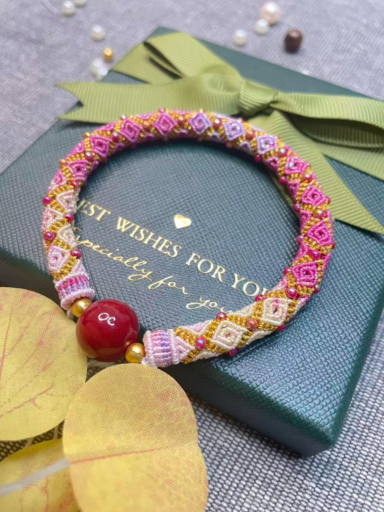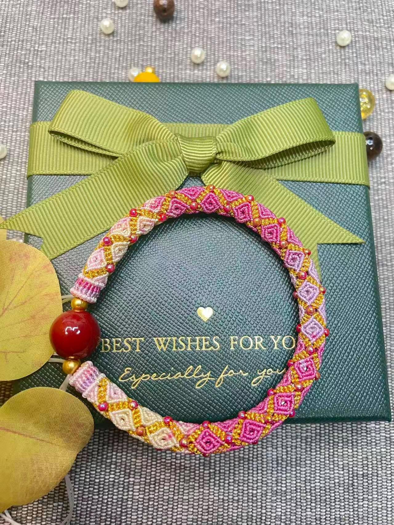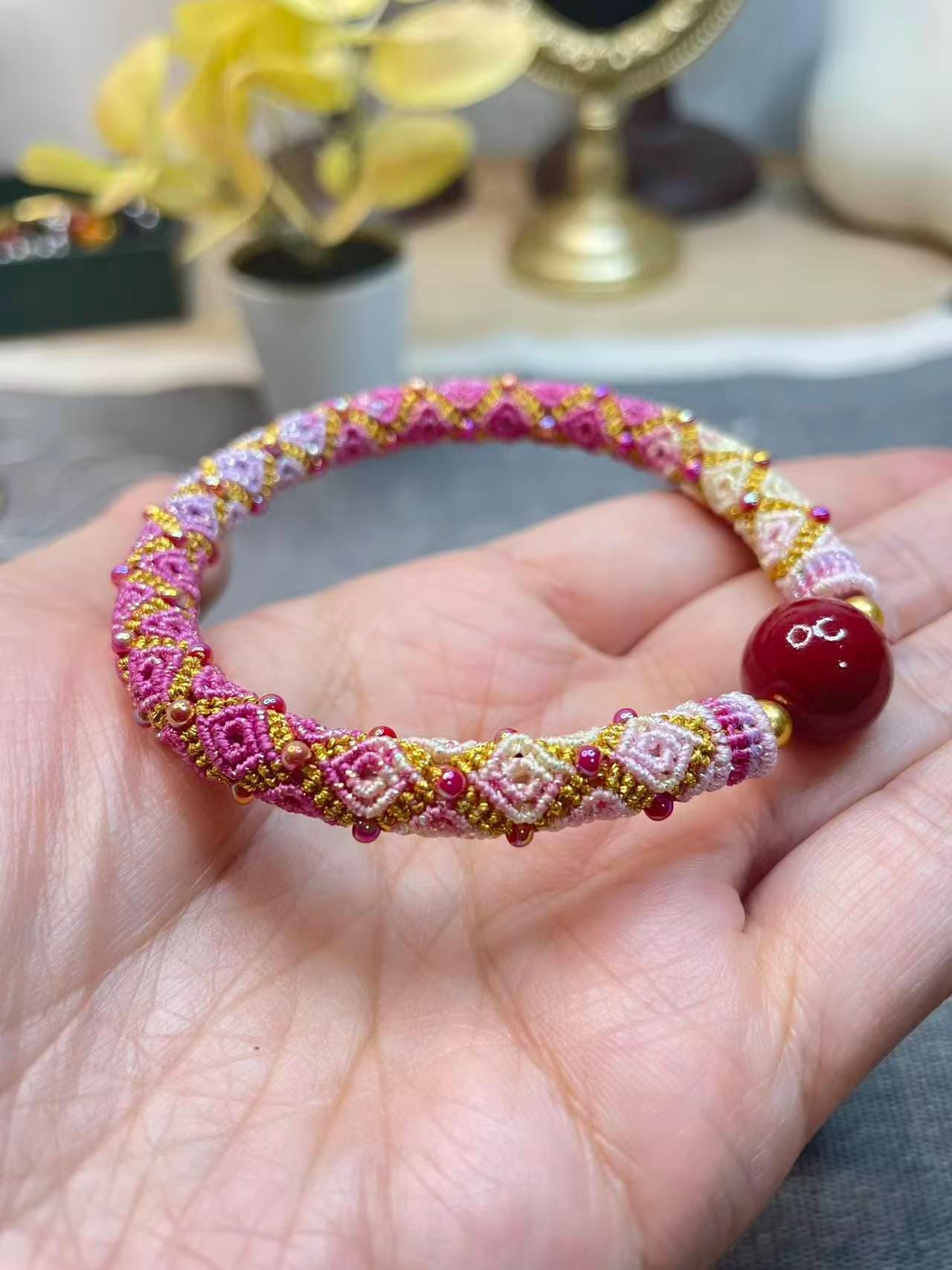 🌸 Handwoven Macrame Bracelet – Pink & Gold Geometric Design with Red Agate Bead