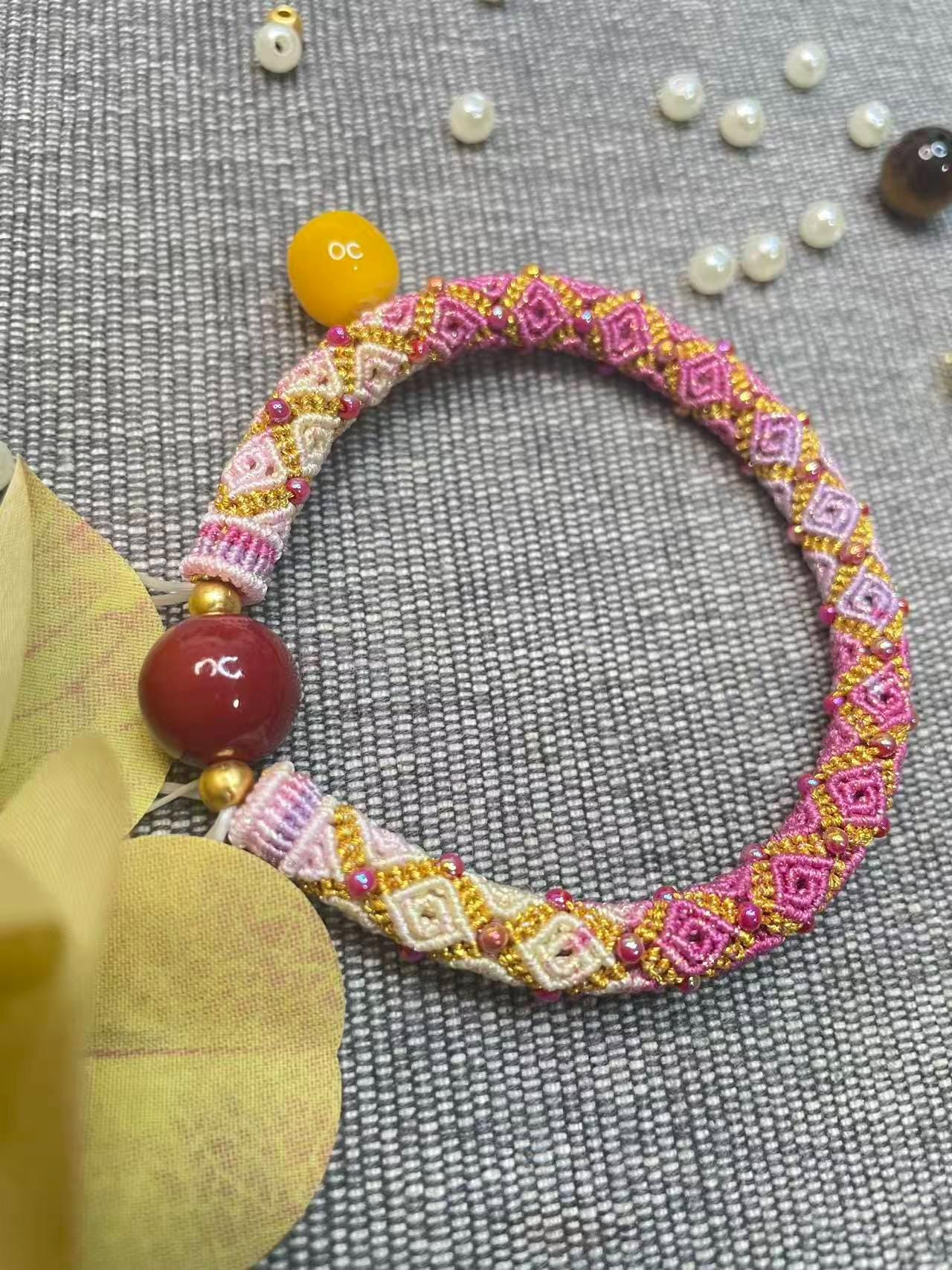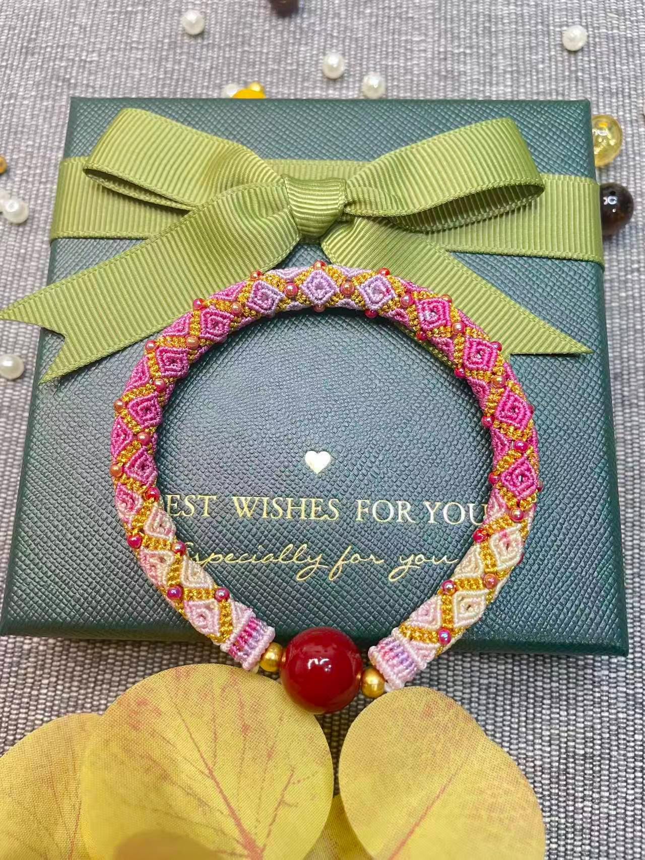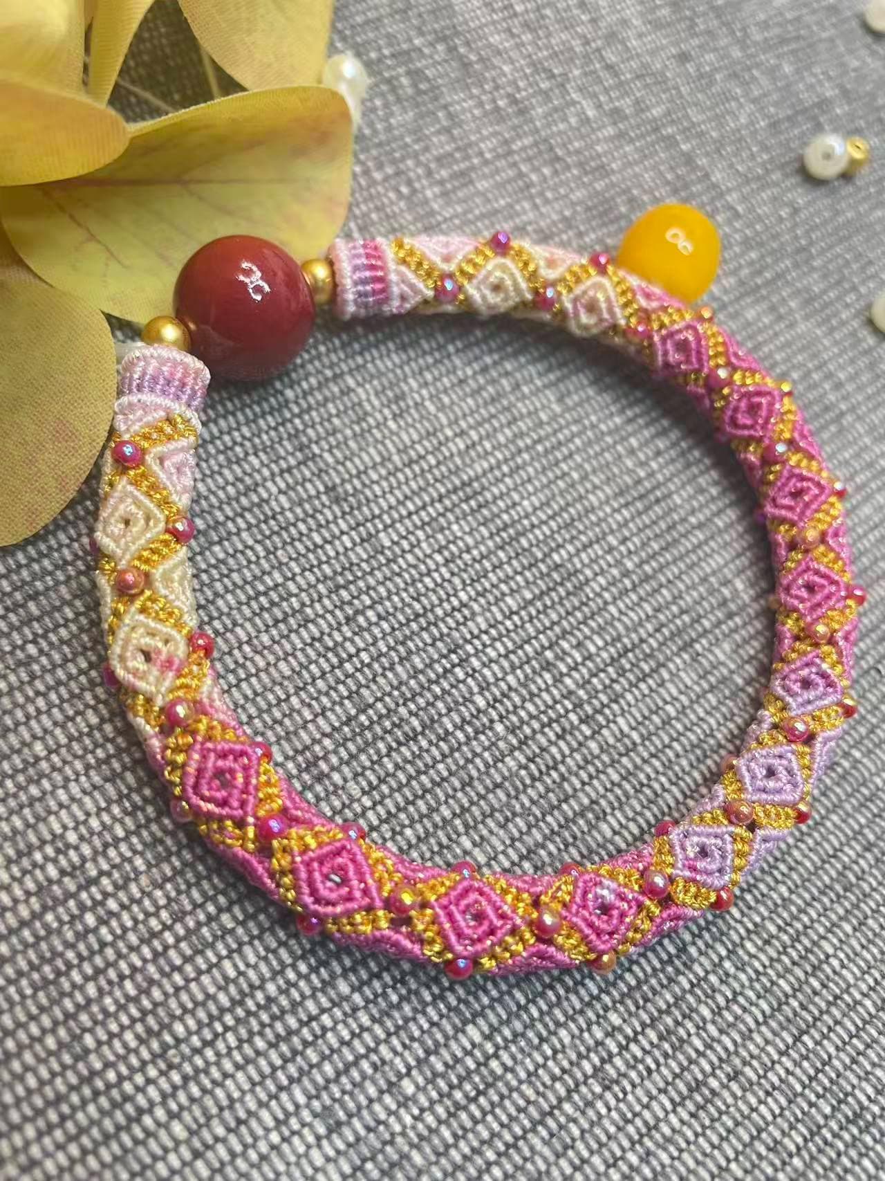 🌸 Handwoven Macrame Bracelet – Pink & Gold Geometric Design with Red Agate Bead