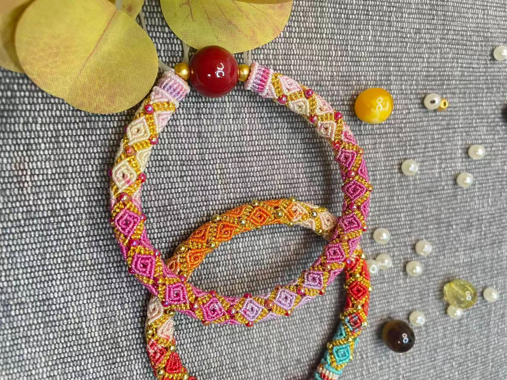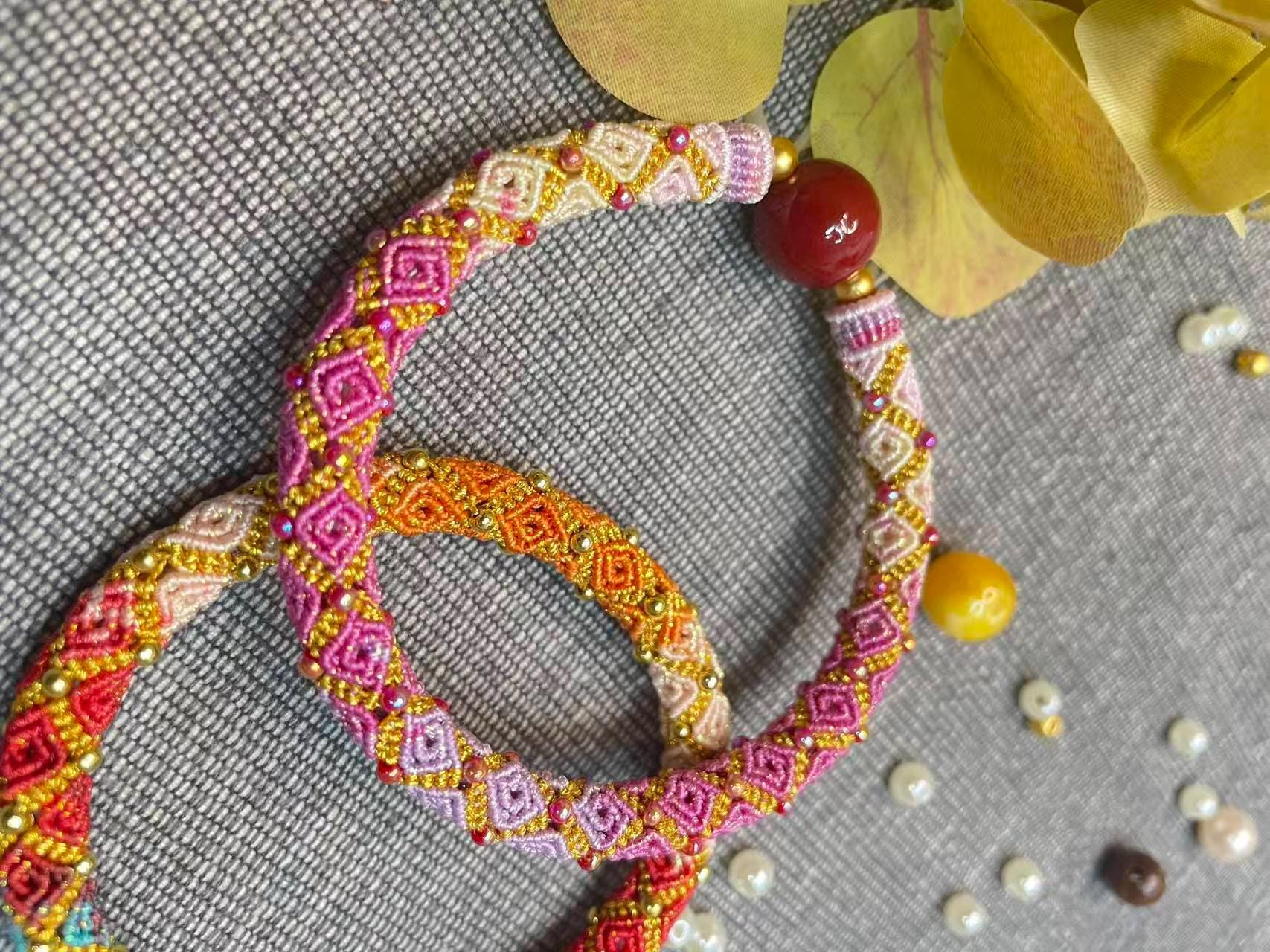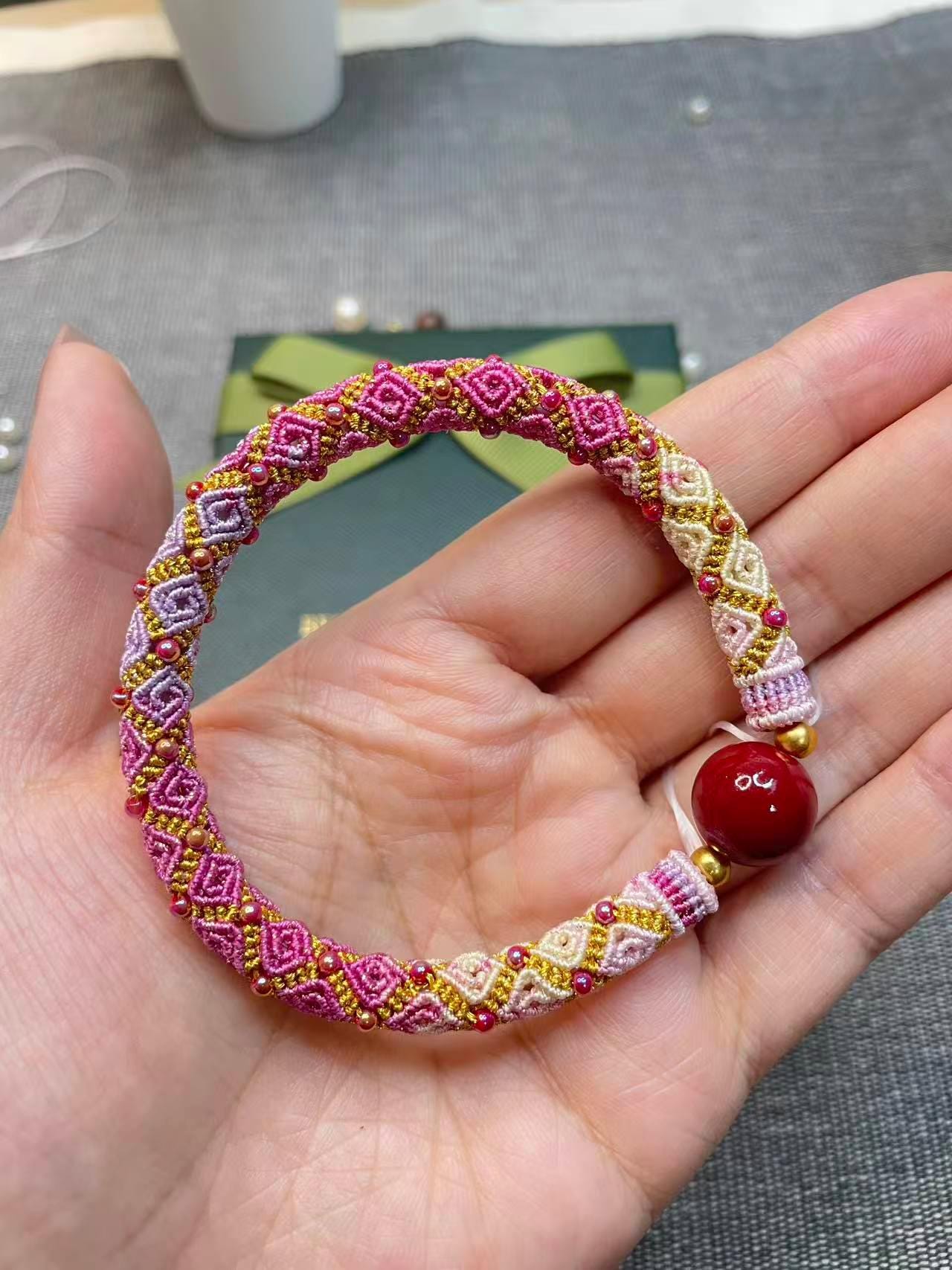 This beautifully hand-woven macrame bracelet features a stunning blend of pink, rose, and ivory threads accented with tiny gold beads. Each diamond-shaped knot is carefully crafted, creating a delicate yet vibrant pattern that feels both elegant and joyful.