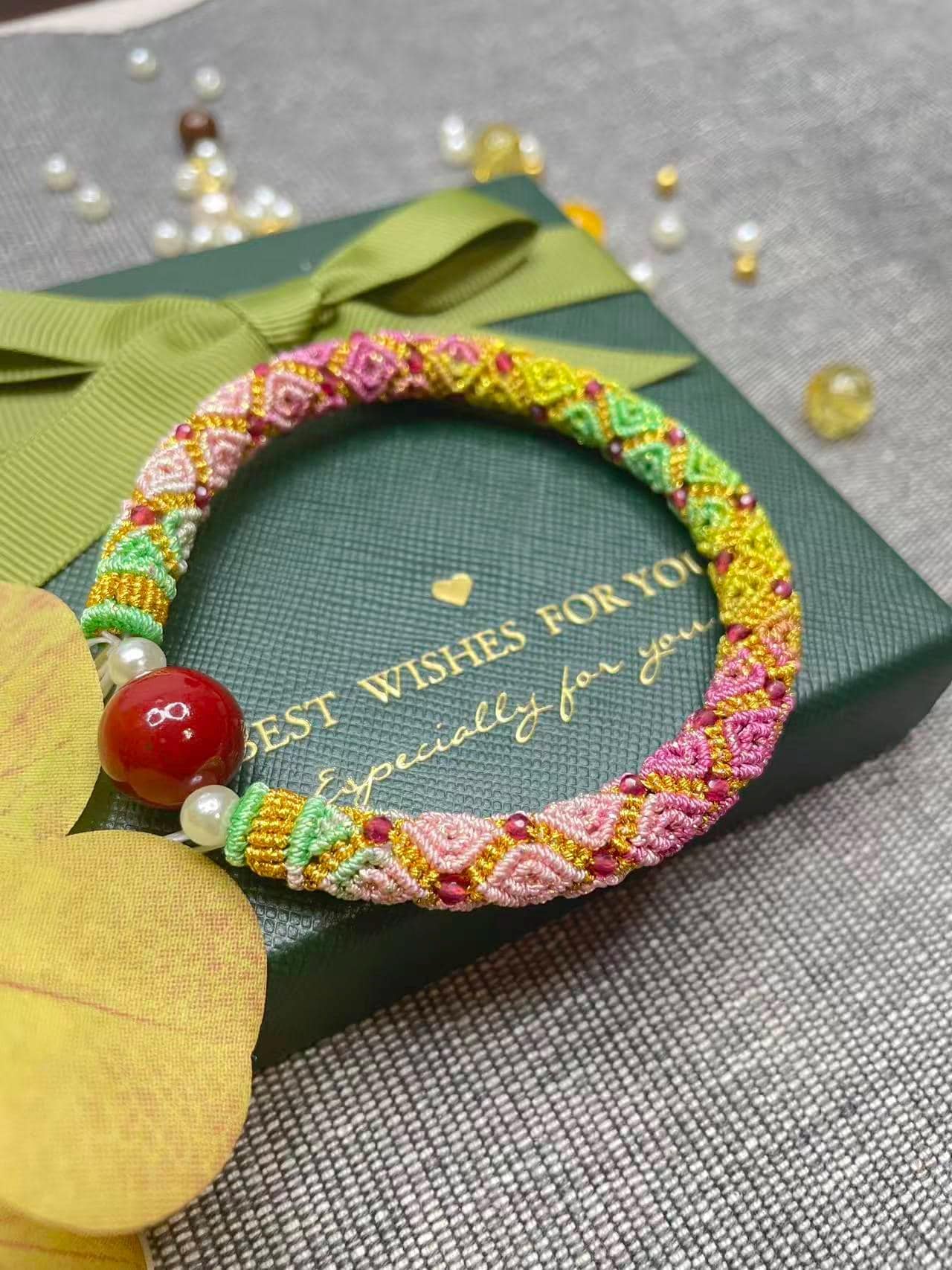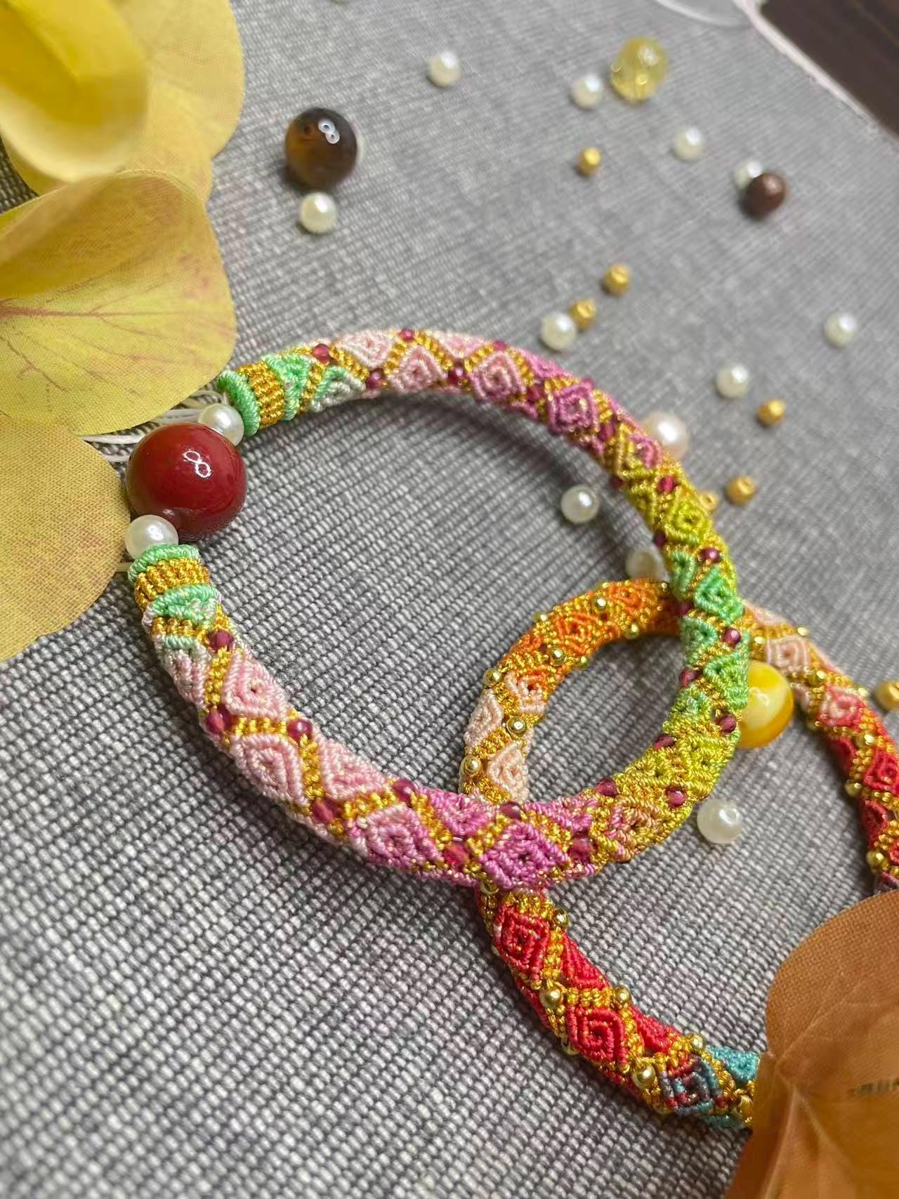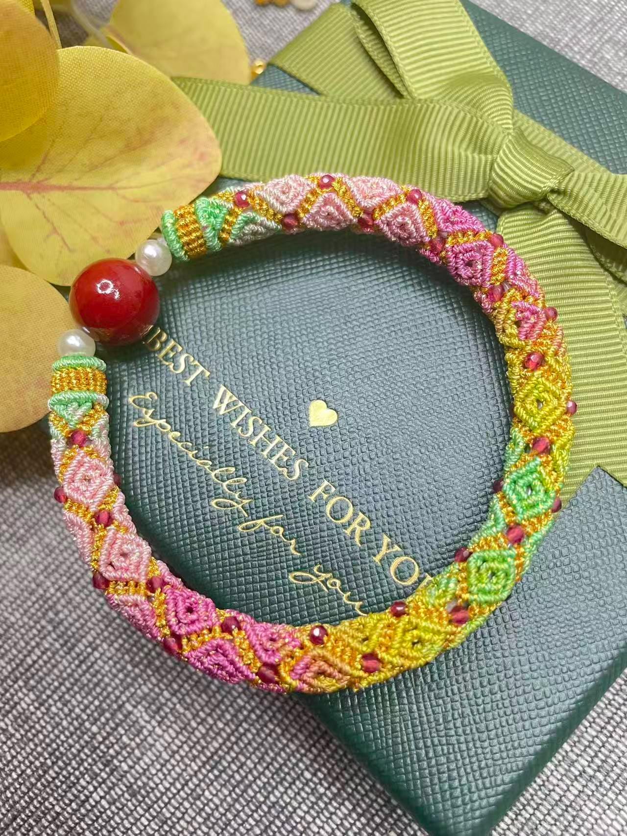Bright, joyful, and full of good energy — this colorful macrame bracelet is hand-woven in a rainbow gradient of pink, green, yellow, and gold tones. Decorated with tiny seed beads and finished with a polished red agate stone, it carries both playful charm and symbolic meaning.