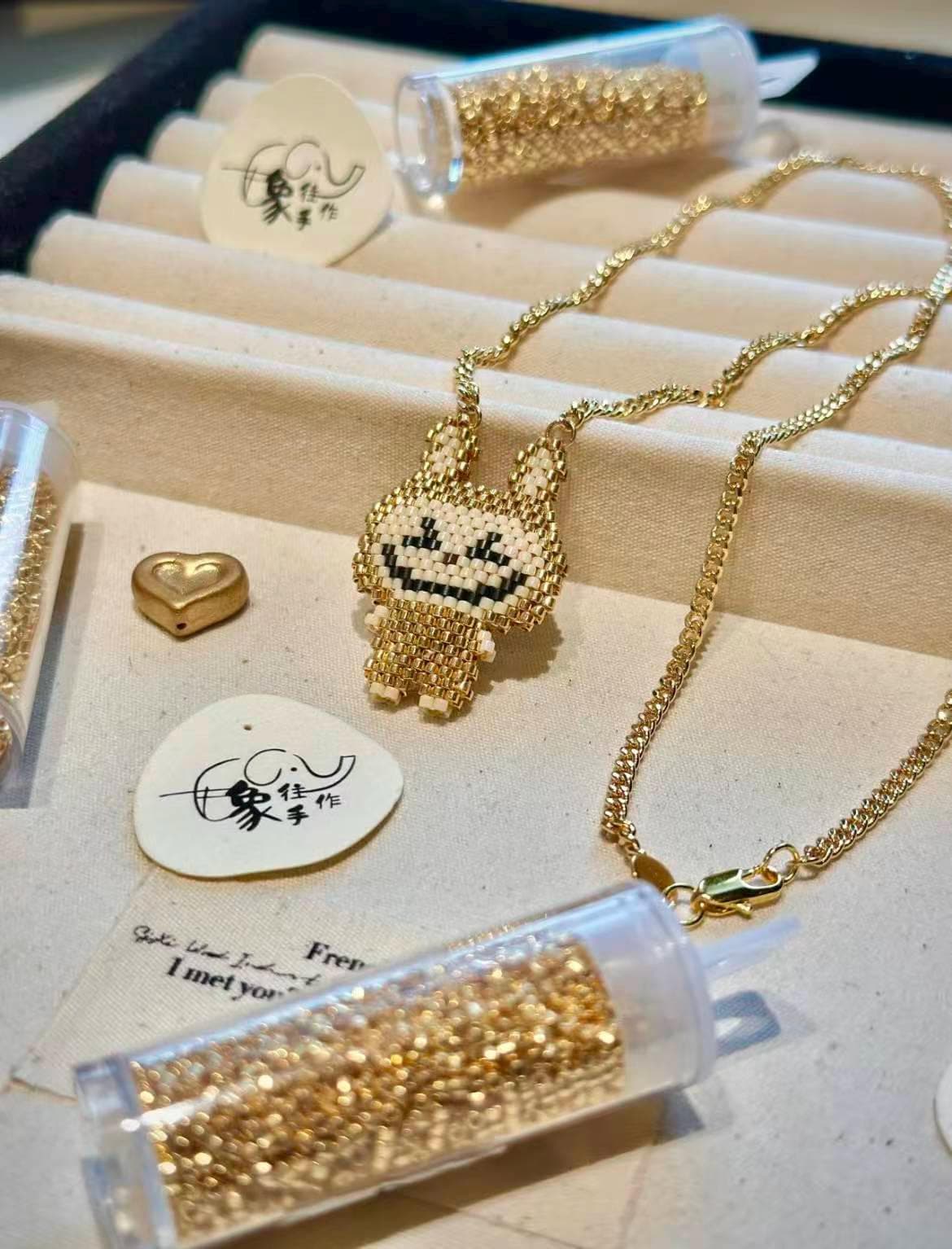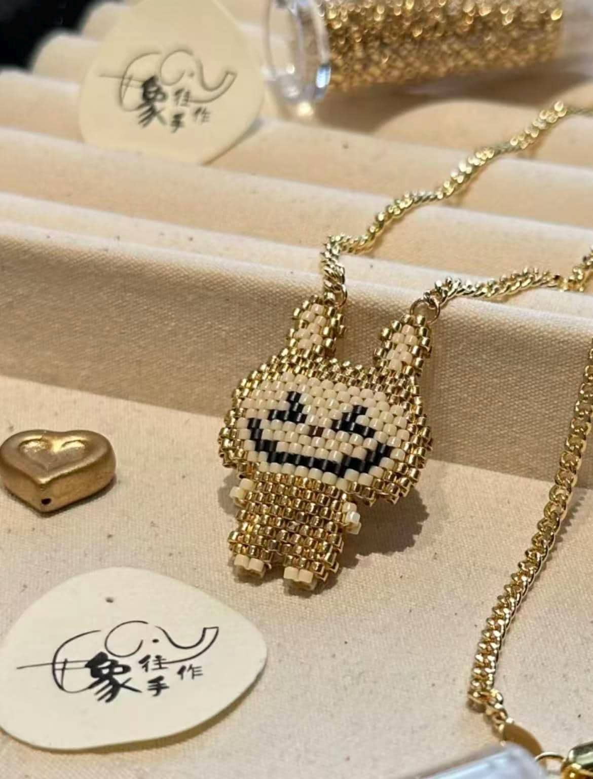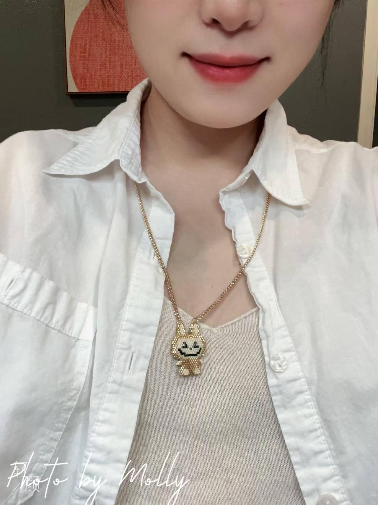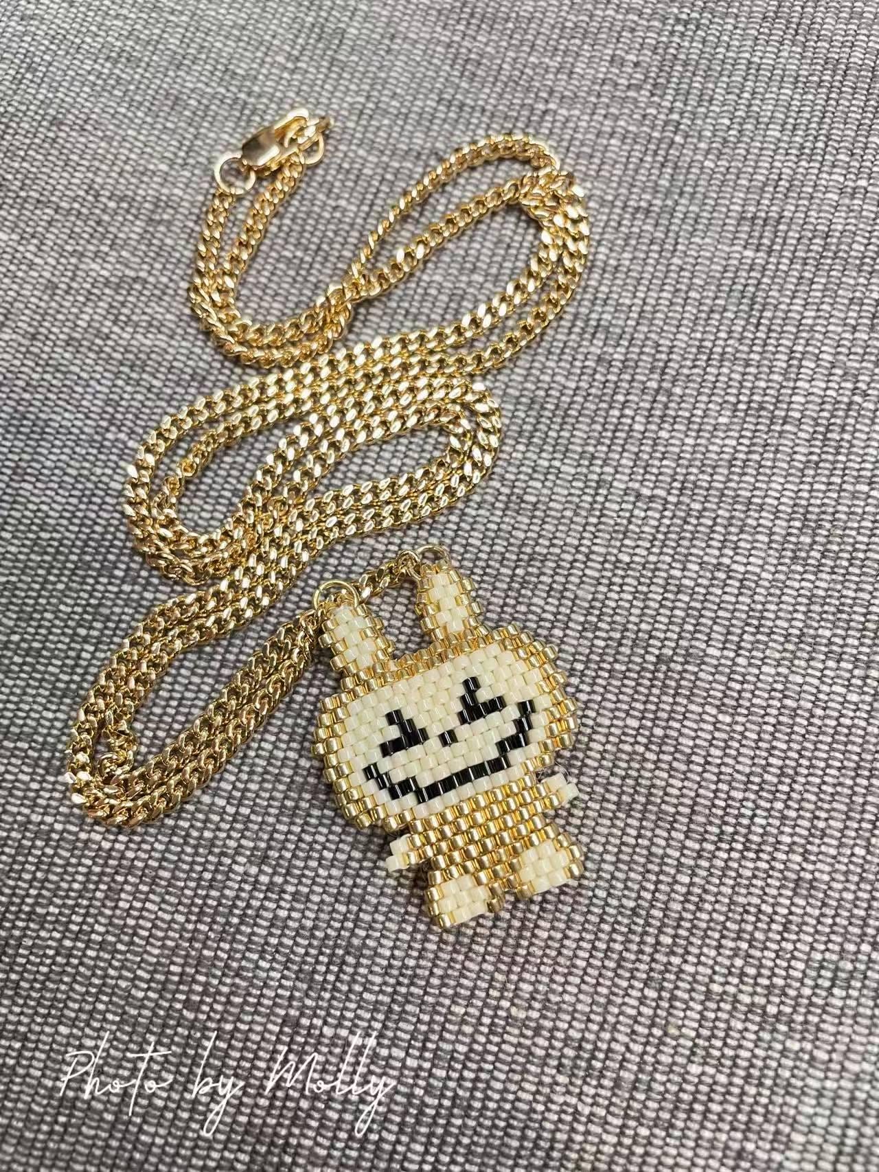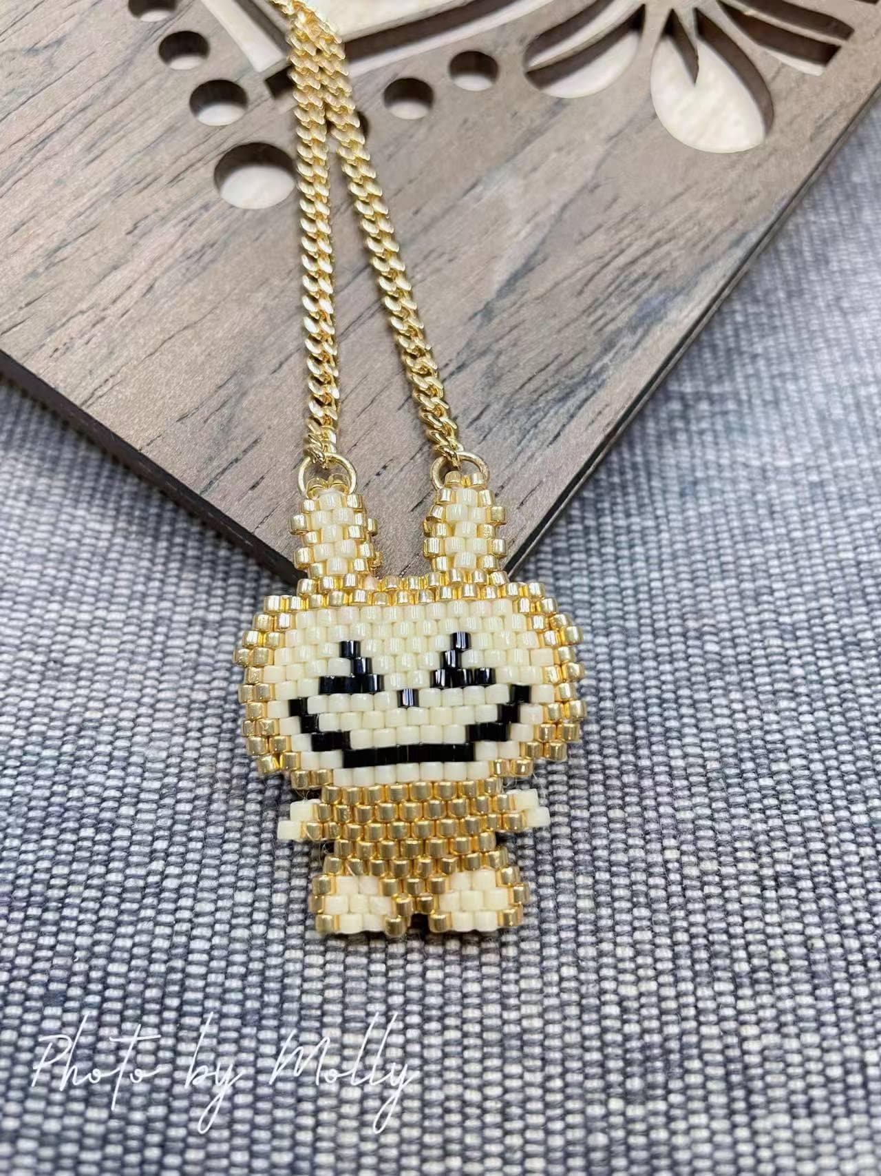 Add a touch of playful charm to your style with this adorable Happy Bunny Beaded Necklace. The pendant is entirely handwoven using premium Japanese MIYUKI gold- and silver-plated seed beads, giving the bunny a bright, metallic sparkle and a smooth pixel-art texture.