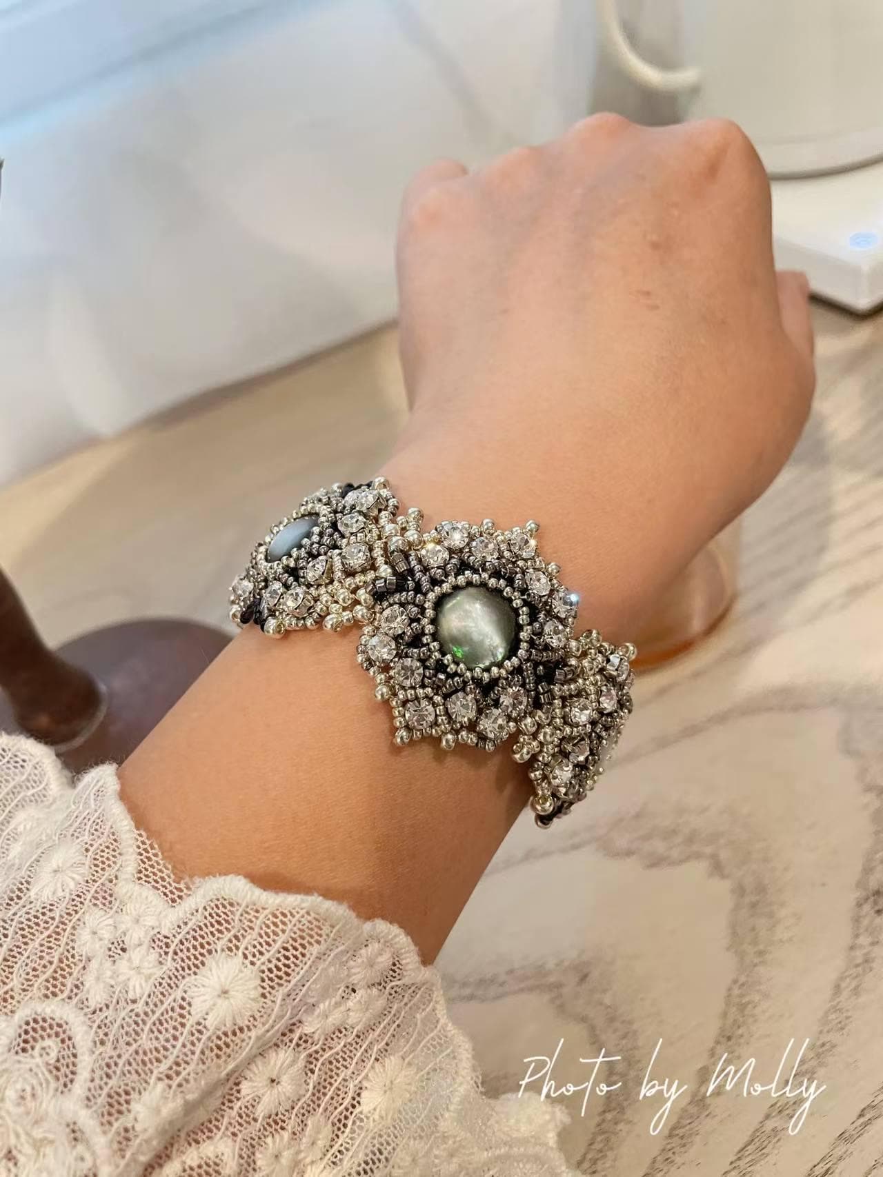 The bracelet forms a continuous row of ornate medallions, each one hand-stitched with exceptional care and precision. The subtle contrast between deep metallic tones and luminous shell highlights adds depth, sophistication, and a timeless antique charm.