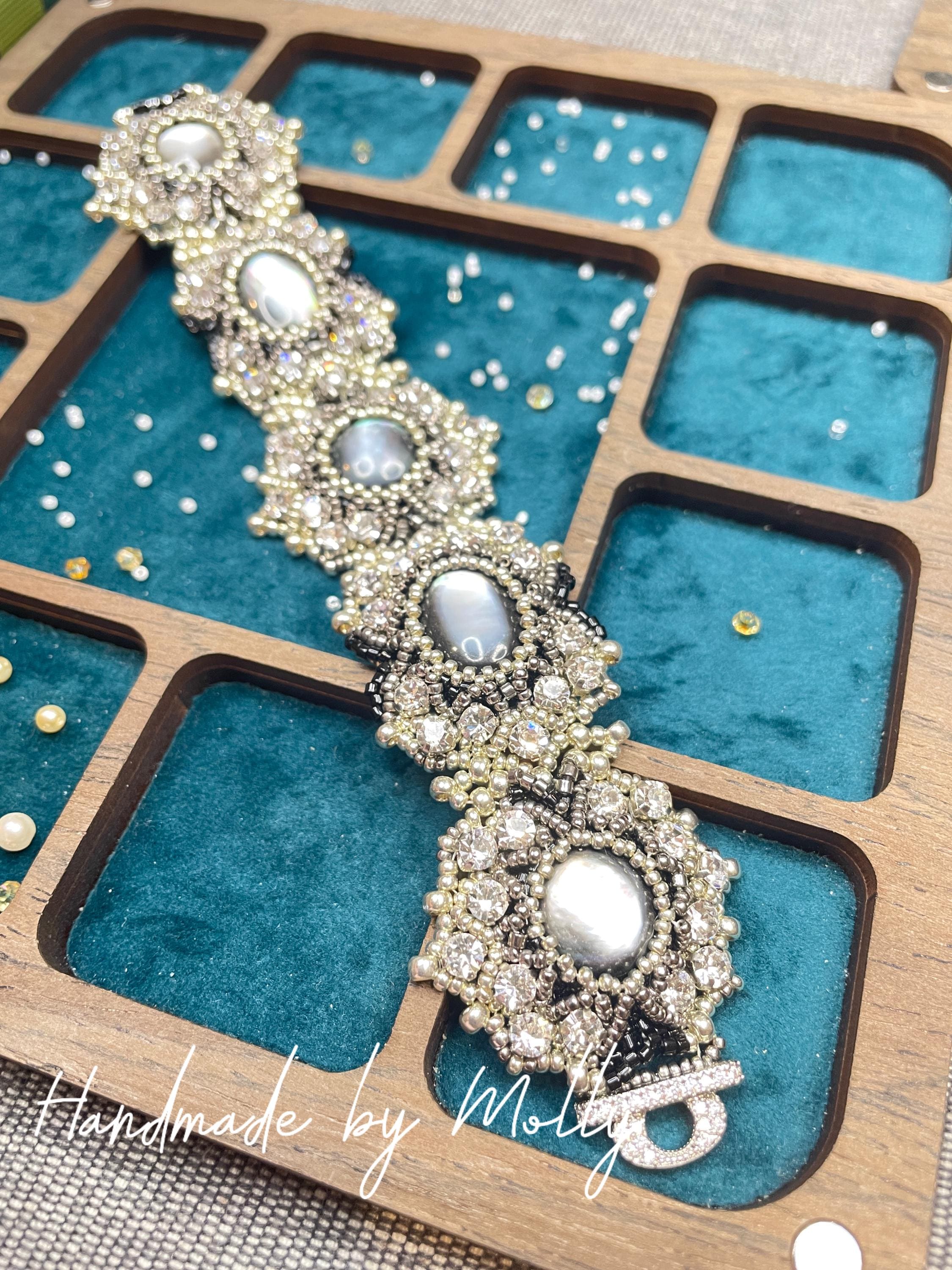Embrace regal elegance with this handcrafted Royal Fleur-de-Lis Black Shell Bracelet, a stunning fusion of vintage opulence and meticulous bead artistry. Each centerpiece showcases a natural black mother-of-pearl shell cabochon, glowing with mysterious iridescence. Surrounding the shells is an intricate arrangement of Japanese MIYUKI seed beads, shimmering crystals, and delicate metallic accents—creating a luxurious, fleur-de-lis–inspired silhouette in every link.